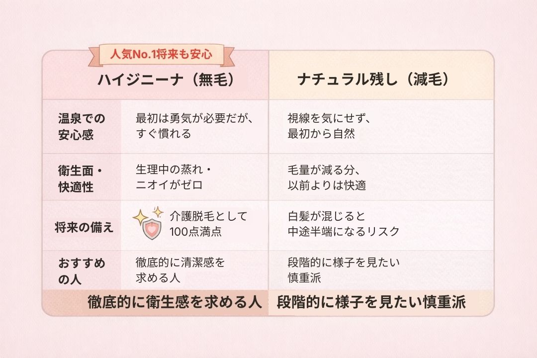 ★滝沢のアドバイス: 迷っているなら、最初の3回だけ「全体照射」をして毛量を減らし、薄くなった状態で一度温泉に行ってみるのがおすすめです。その時に「やっぱり全部ない方が楽そう!」と思えば、そこからハイジニーナに切り替えることができます。